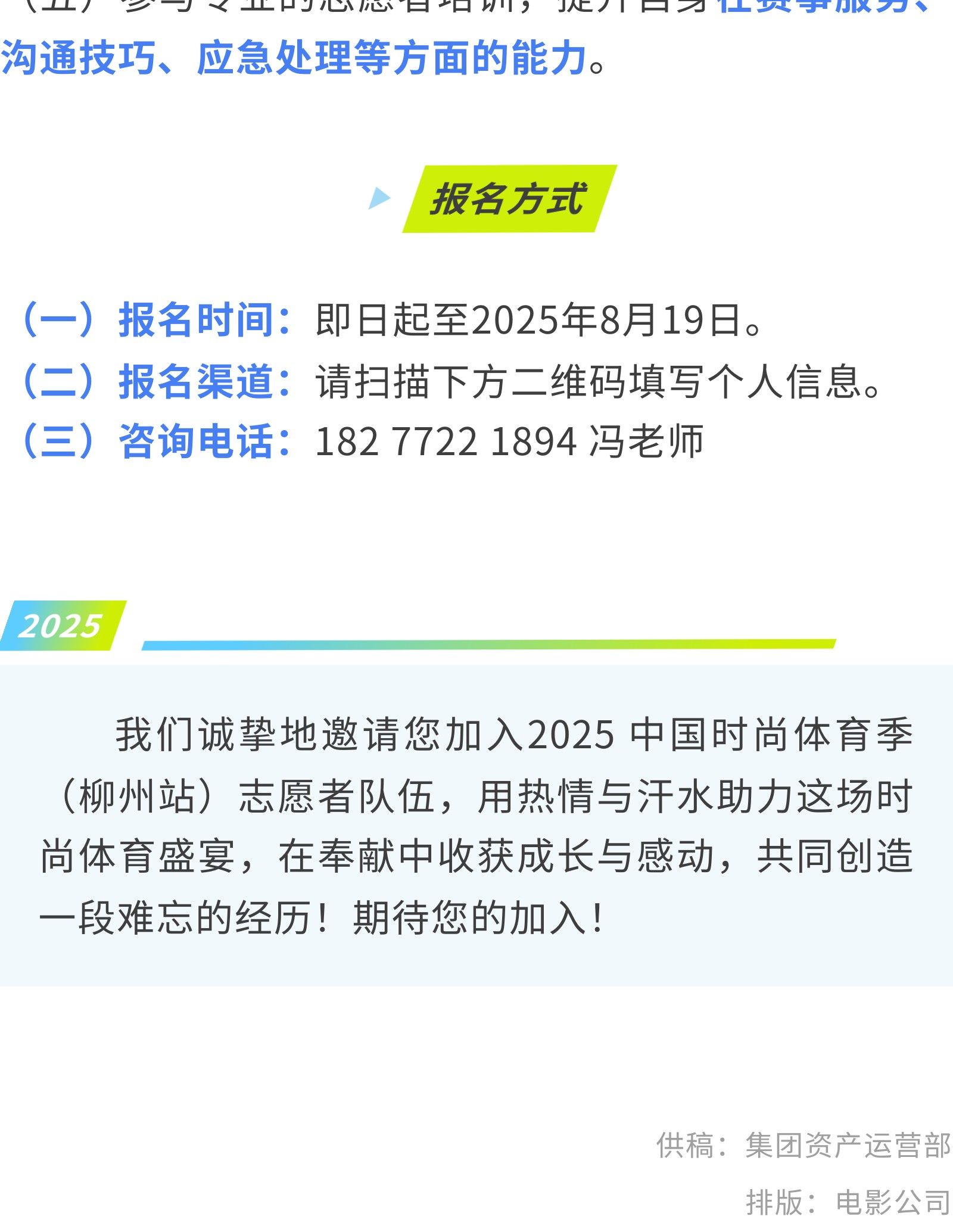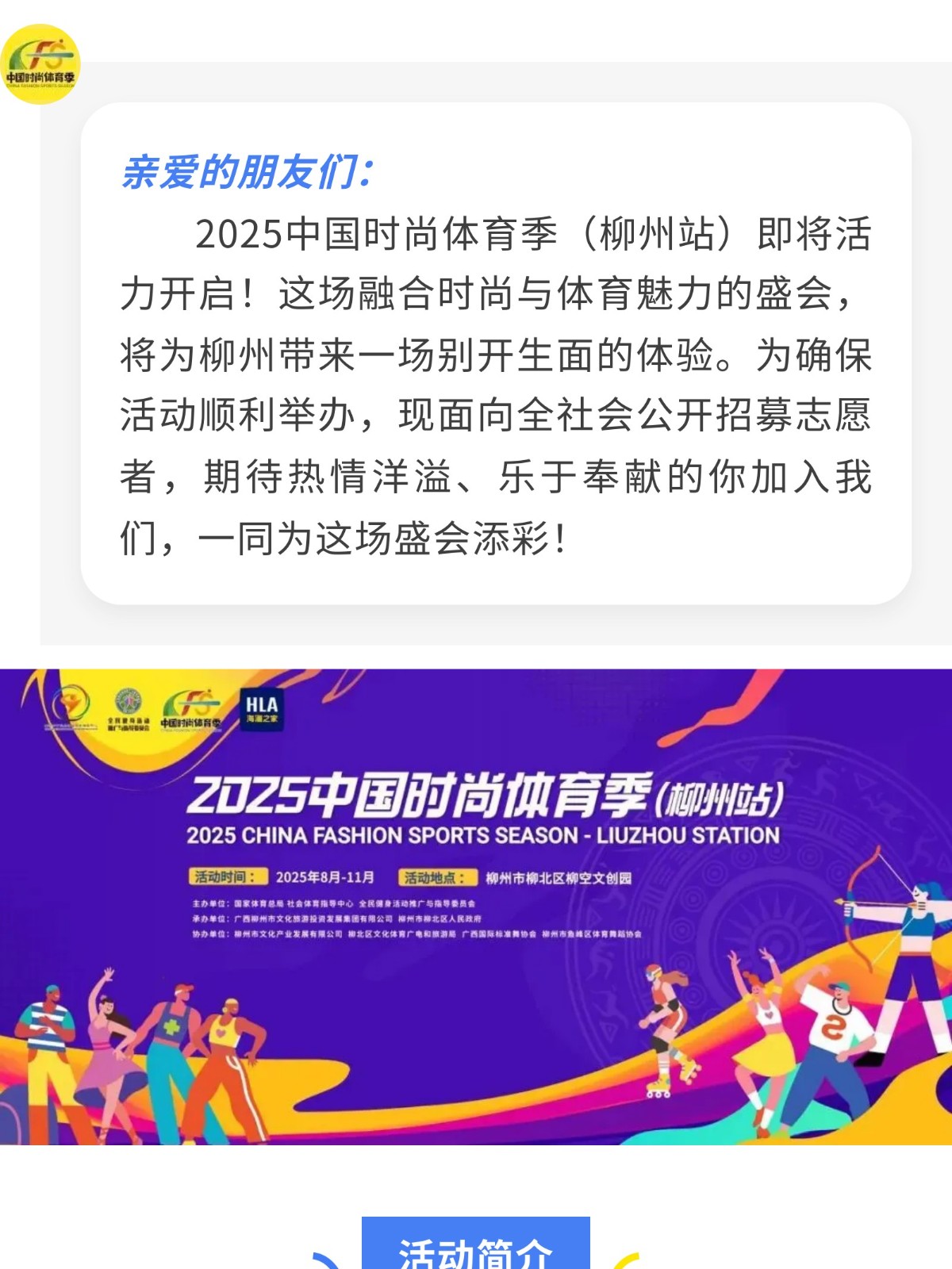 加入我們!2025 中國時尚體育季(柳州站) 志愿者招募中! 發(fā)布時間:2025年08月15日 10時來源:本站原創(chuàng)瀏覽:76 人次