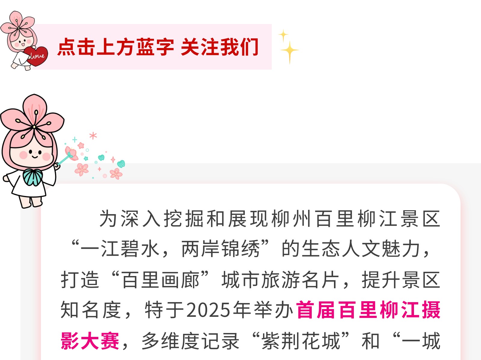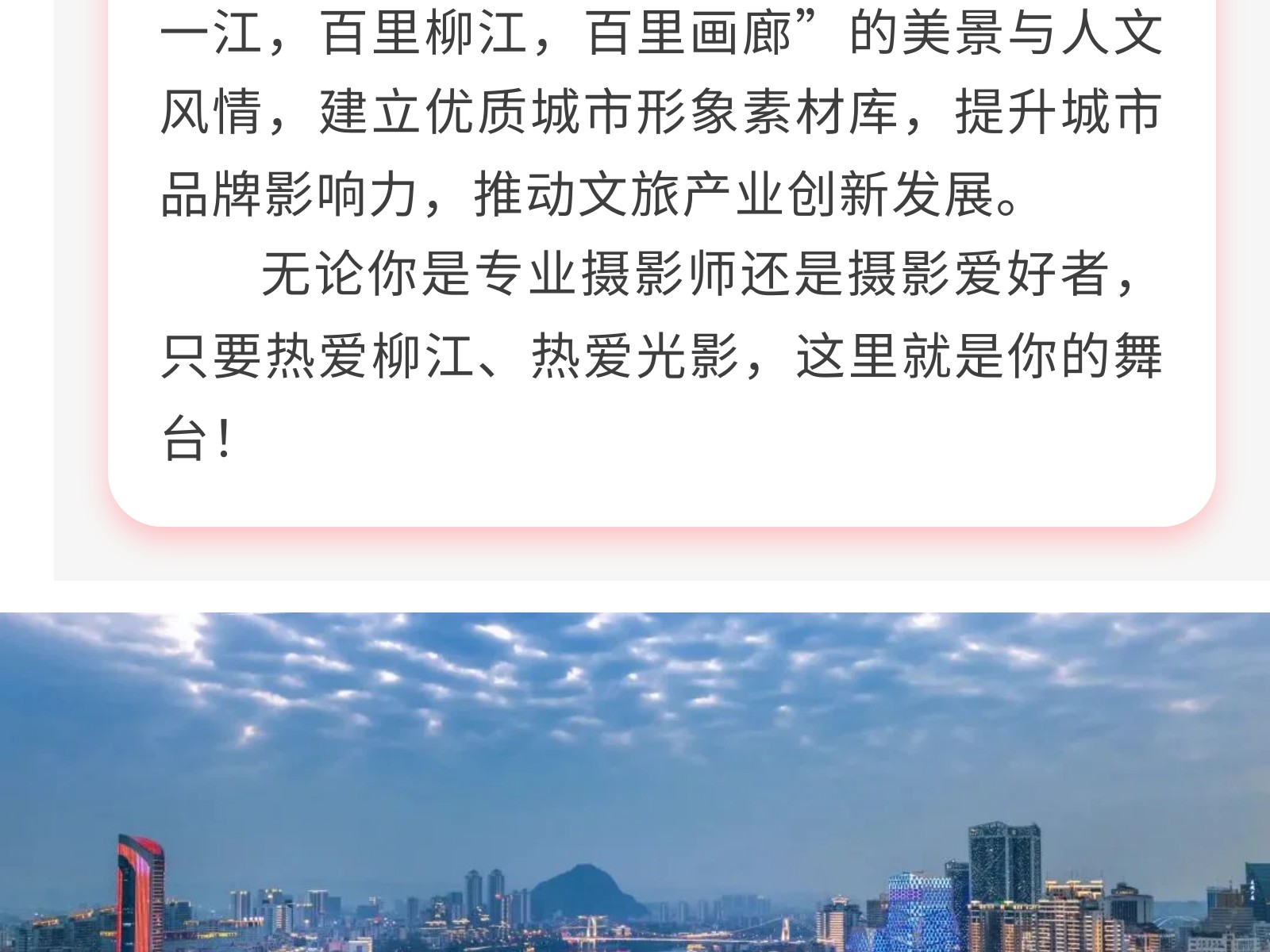 定格最美柳江!首屆“百里柳江”攝影大賽火熱征集中,邀你共賞百里畫廊! 發(fā)布時(shí)間:2025年04月26日 16時(shí)來源:本站原創(chuàng)瀏覽:66 人次